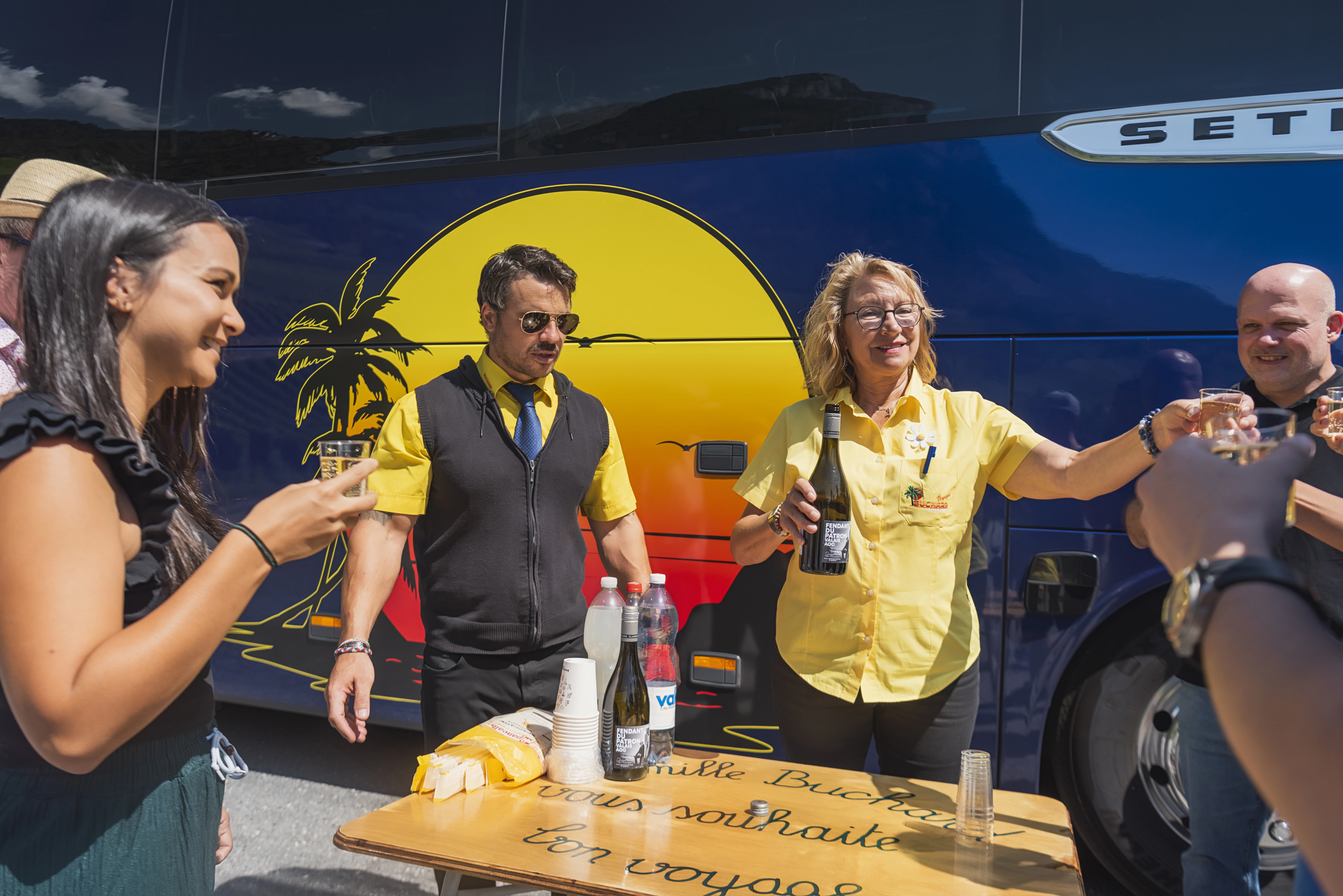 Pendant le voyage, les chauffeurs ont la mission de vous conduire en toute sécurité et de vous assister lors de votre séjour, avec l’aide précieuse de nos accompagnatrices sur les voyages du catalogue. Notre personnel de bord vous sert également avec grand plaisir notre traditionnel Coup de fendant du Patron.
