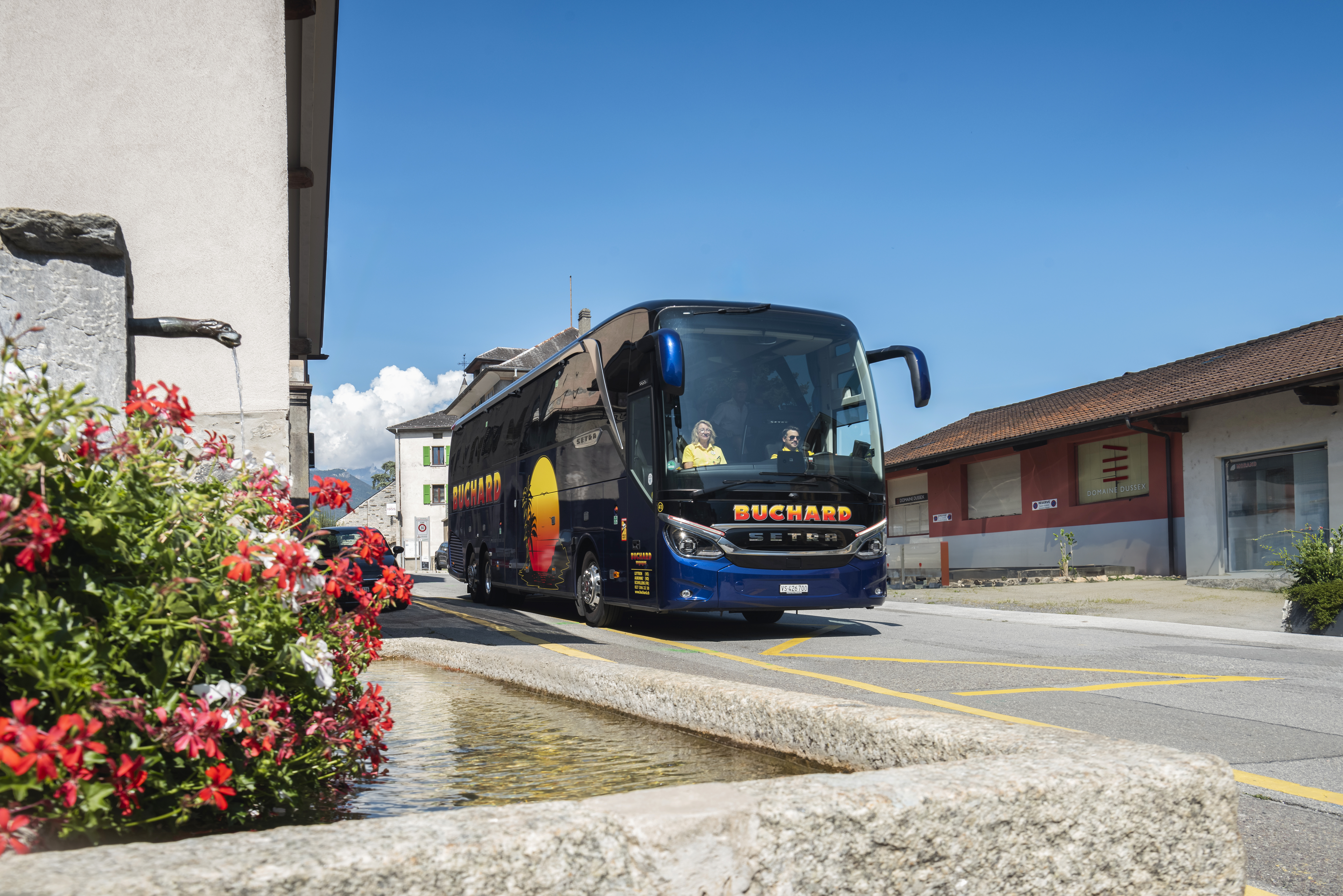 Une fois partis, elle sert le café puis partage des informations avec les clients sur les lieux et régions que le car traverse. Elle reste également au service des clients tout au long du trajet pour toute question ou besoin. Lors du voyage, ou si un arrêt est possible, elle sert le fameux coup de Fendant du Patron.